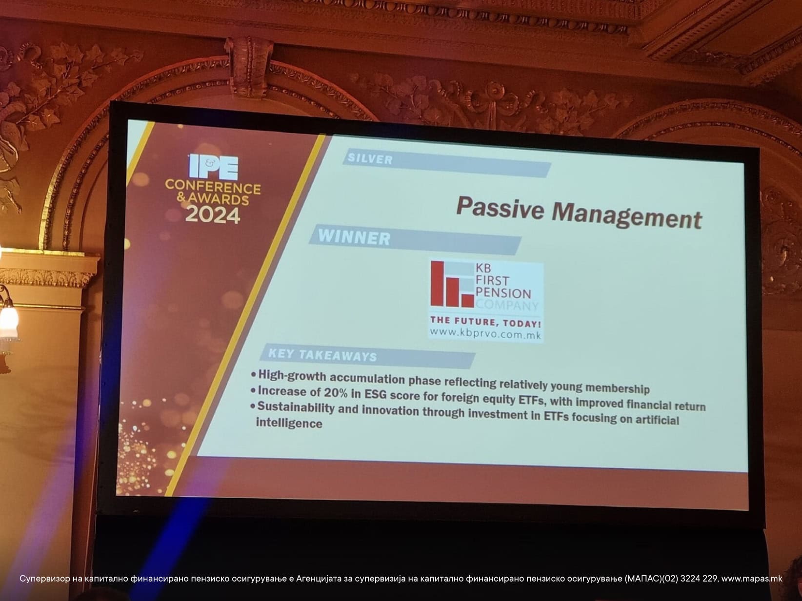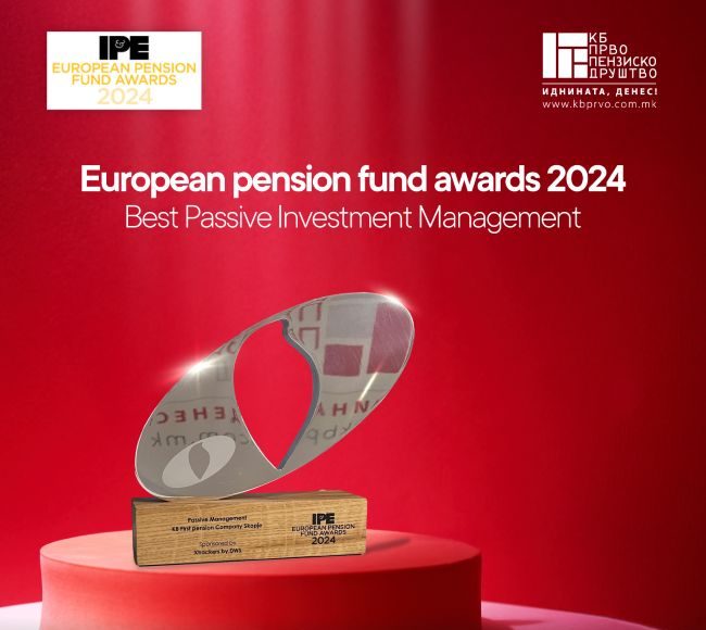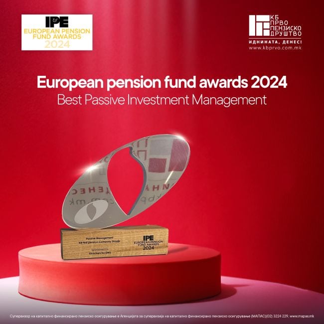 Со огромна чест и задоволство известуваме дека на престижната церемонија на Европските награди за пензиски фондови, која се одржа на 03.12.2024 година во Прага, организирана од IPE (Investment & Pensions Europe), нашето Друштво беше наградено со престижното признание за „Најдобро пасивно управување со инвестиции“.