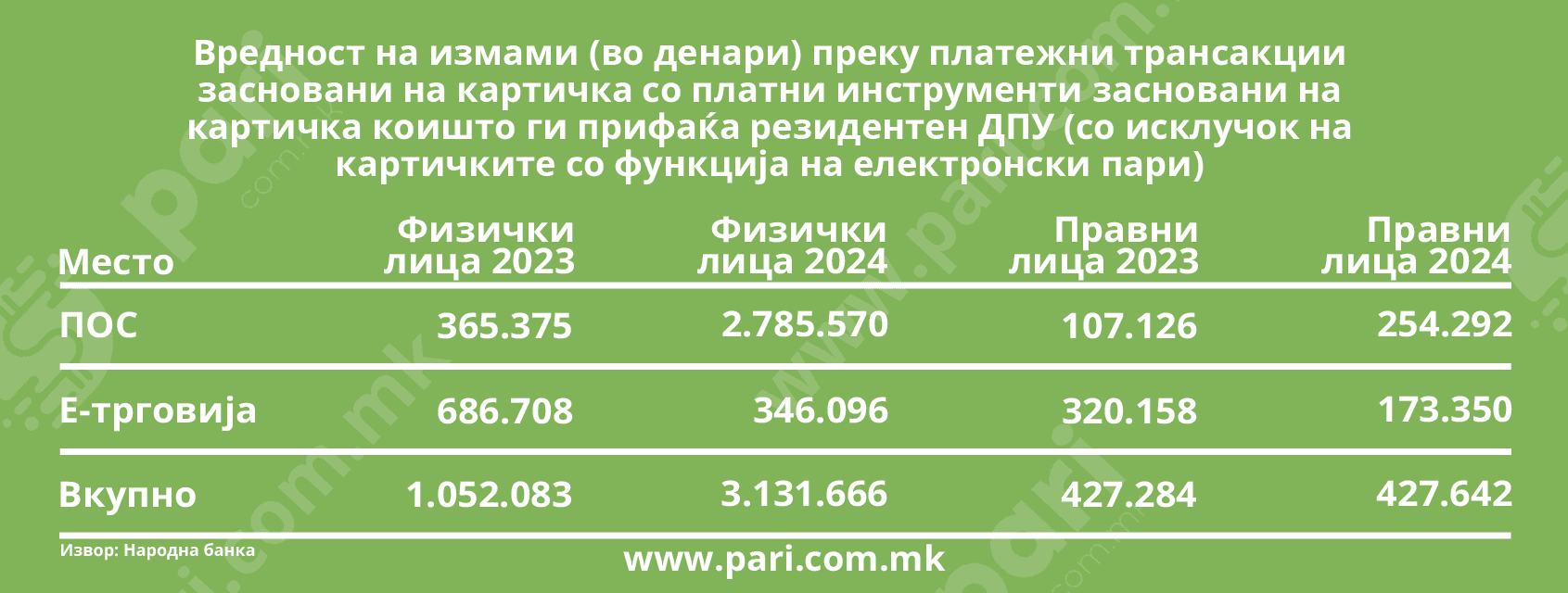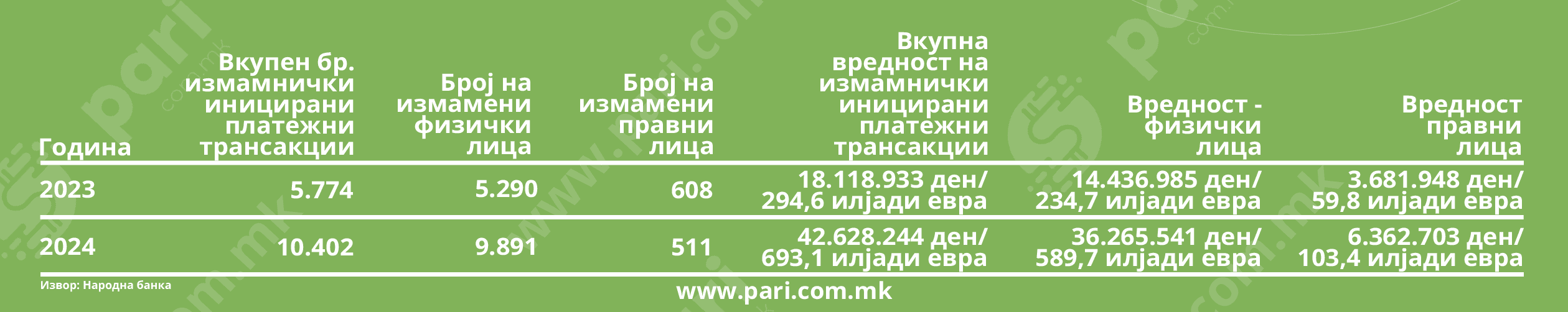 Минатата година биле измамени 9.891 физичко лице. За 87,01% повеќе од 2023 година, кога плаќајќи со картичка биле „изгорени“ 5.290 лица. Кај правните лица ситуацијата е сосема поинаква. Од 608 измамени преклани, лани бројката се спуштила на 511. Падот е означен со 15,95 проценти.