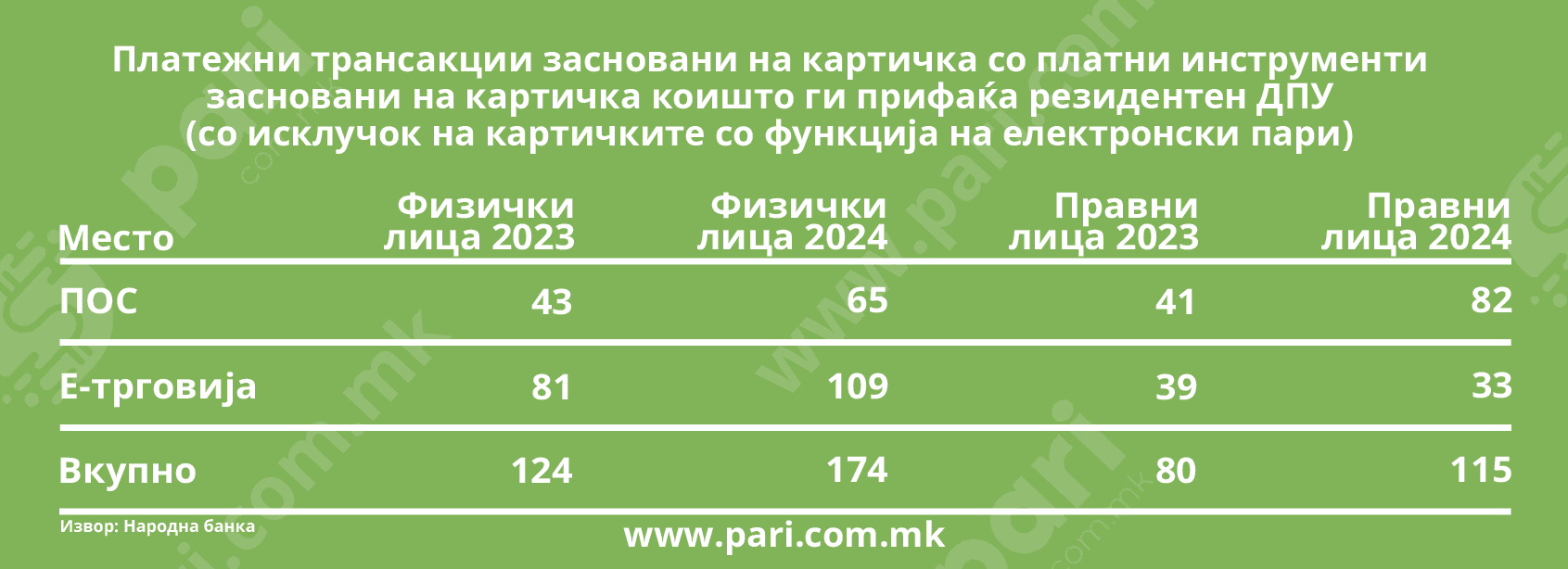 Минатата година биле измамени 9.891 физичко лице. За 87,01% повеќе од 2023 година, кога плаќајќи со картичка биле „изгорени“ 5.290 лица. Кај правните лица ситуацијата е сосема поинаква. Од 608 измамени преклани, лани бројката се спуштила на 511. Падот е означен со 15,95 проценти.