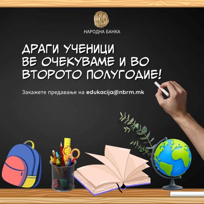 Со почетокот на второто полугодие од учебната година, започнува и новиот циклус предавања на Народната банка од областа на финансиската едукација. Во современите услови на динамичен финансиски систем, финансиската едукација станува сѐ попотребна за сите граѓани. Токму затоа, финансиската едукација е дел од стратегиските цели на Народната банка, којашто преку обезбедување непрекинатост во процесот и постојано зголемување на опфатот на населението од различни целни групи, цели кон унапредување на финансиската писменост во земјава.