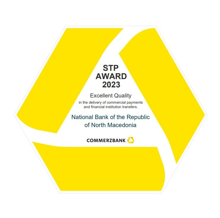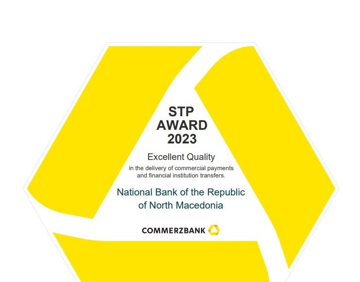 Народната банка по вторпат е добитничка на наградата на Комерцбанк, којашто претставува една од водечките меѓународни деловни банки во Европа. Наградата се доделува за 2023 година, за квалитетно автоматизирано извршување на плаќањата на државните органи и на трансферите со финансиските институции во меѓународниот платен промет. Ова е големо признание за Народната банка коешто го доби за високото ниво на квалитет и автоматизираност на процесите при извршувањето на плаќањата, во конкуренција со голем број финансиски институции и компании на меѓународно ниво.