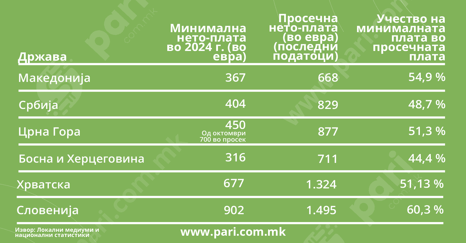 Според податоците, на Словенија нема да ѝ биде тешко да ја исполни Европската директива. Минималната плата таму дури за малку и надминува 60 насто од просечната плата. Иако Македонија е на опашката од оваа листа по висината на минималната плата во износ (од нас пониска минимална плата има само Босна и Херцеговина), од сите преостанати има подобар сооднос меѓу минималната и просечната плата. За жал, просечната плата ни е убедливо најниска во регионот.