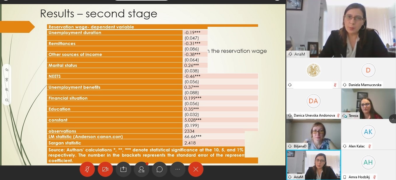 Во трудот на Кочовска се оценуваат детерминантите на најниската прифатлива (условна) плата, особено нејзината поврзаност со траењето на невработеноста. Резултатите коишто ги презентира на сесијата, укажуваат на тоа дека меѓусебното дејство на условната плата и траењето на невработеноста е контрациклично, односно дека зголемувањето на траењето на невработеноста ја намалува најниско прифатливата (условната) плата.
