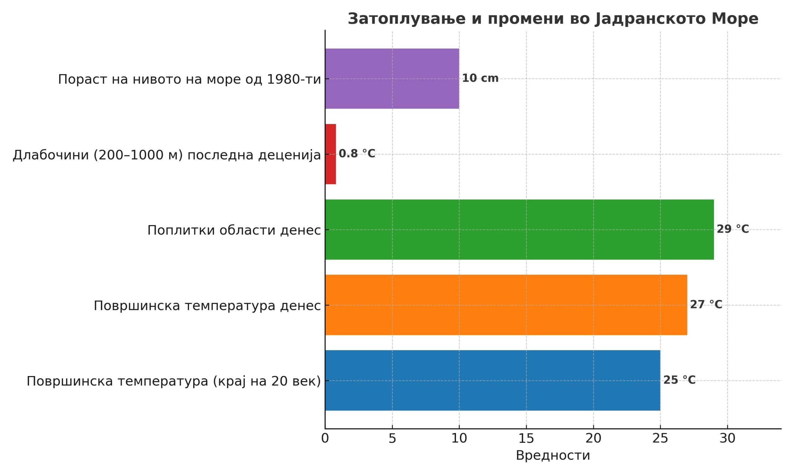 Пеколните летни температури не предизвикуваат само шумски пожари и потешкотии за нормалниот живот на луѓето во областите на јужна Европа, во кои спаѓа и поширокиот дел на Балканскиот полуостров, туку создаваат и ненадоместливи загуби и тешки последици и на морскиот свет, а трендот не го заобиколи ниту Јадранот. Температурата на Јадранското Море денес е повисока отколку било кога во минатото – и трендот на затоплување продолжува. Во последните дваесет години, површинските летни температури често надминуваат 27 °C, а во поплитките области достигнуваат и 29 °C, што е за 1–2 °C повеќе од крајот на минатиот век. Најновите мерења покажуваат дека дури и длабоките слоеви се затоплуваат – во јужниот Јадран, на 200–1000 метри, температурата пораснала за 0,8 °C за само една деценија, вели д-р Наталија Дуниќ од Институтот за океанографија и рибарство во Сплит, Хрватска, во авторски текст за Klima101.rs.