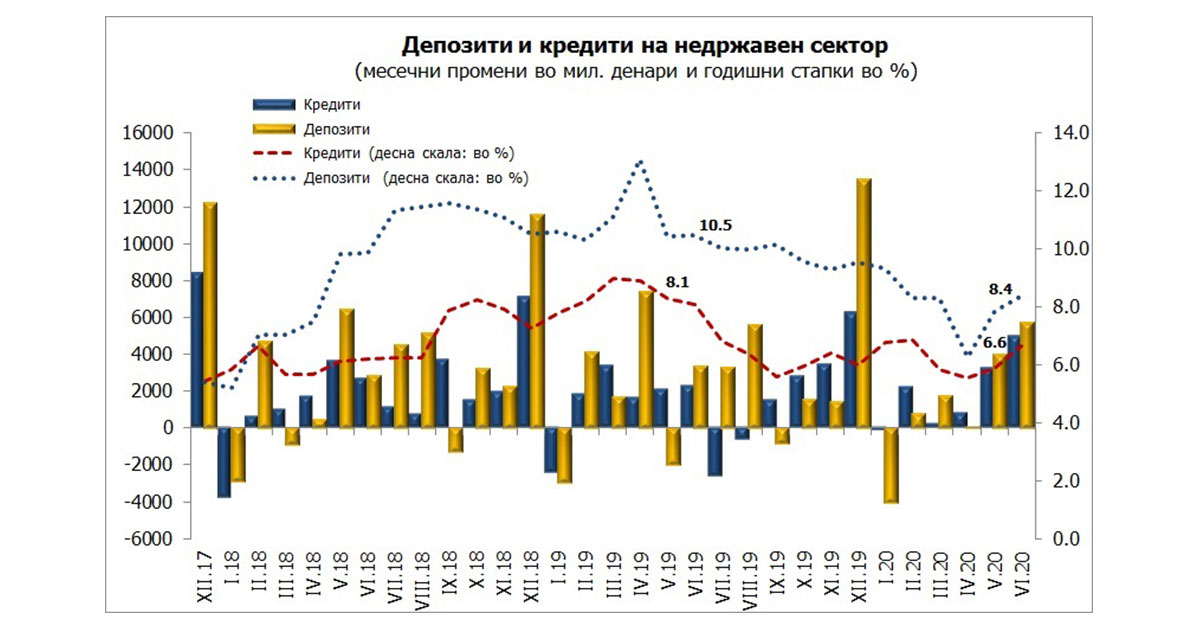 🔸 На годишна основа, депозитите на корпоративниот сектор и на секторот „домаќинства” се зголемени за 11,2% и 8,7%, соодветно.