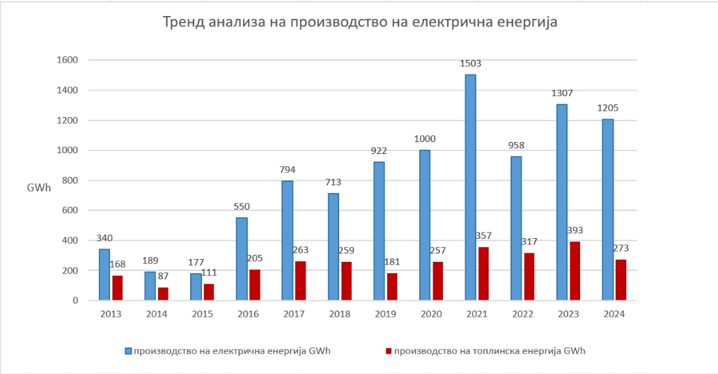 Гледано низ годините, највисоко производство на електрична енергија е забележано во 2021 година – 1.503 GWh. А, на топлинска енергија во 2023 година – 393 GWh. Од 2016 до 2021 година производството на струја е во континуиран раст. Потоа има осцилации – пад во 2022, раст во 2023 и умерен пад во 2024 година. Кај топлинската енергија, трендот е пофлуктуирачки, со постепено зголемување до врвот во 2023, а потоа пад во 2024 година.