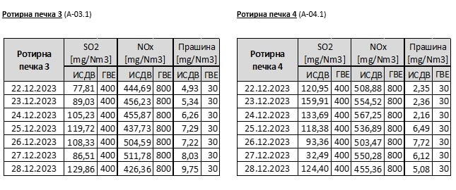 Неделен извештај за измерени средно-дневни вредности на емисии од главните емисиони точки во Цементарница УСЈЕ (22.12.2023 – 28.12.2023)