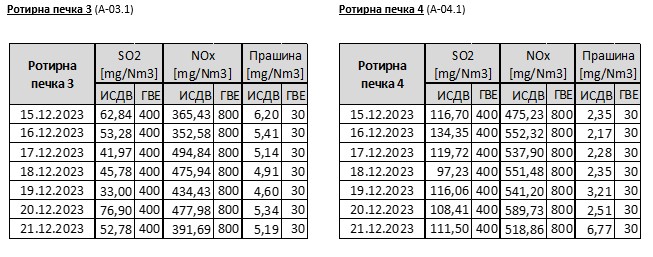 Неделен извештај за измерени средно-дневни вредности на емисии од главните емисиони точки во Цементарница УСЈЕ (15.12.2023 – 21.12.2023)