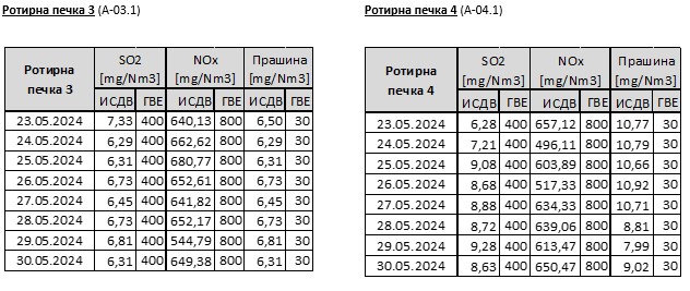 Неделен извештај за измерени средно-дневни вредности на емисии од главните емисиони точки во Цементарница УСЈЕ (23.05.2024 – 30.05.2024)
