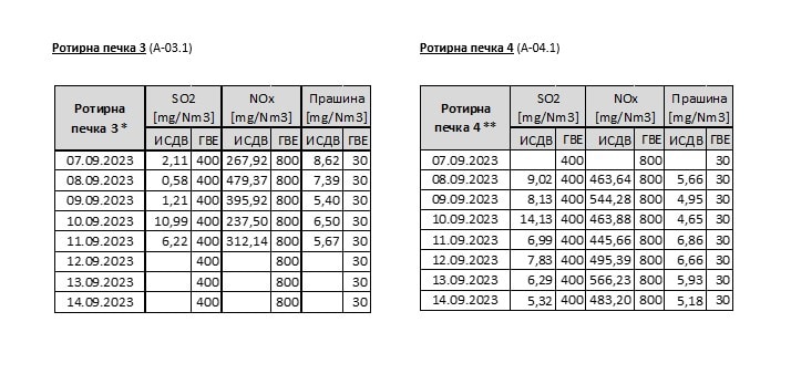 Неделен извештај за измерени средно-дневни вредности на емисии од главните емисиони точки во Цементарница УСЈЕ (07.09.2023 – 14.09.2023)