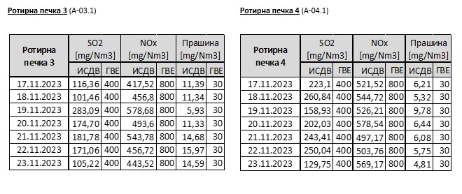 Неделен извештај за измерени средно-дневни вредности на емисии од главните емисиони точки во Цементарница УСЈЕ (17.11.2023 – 23.11.2023)