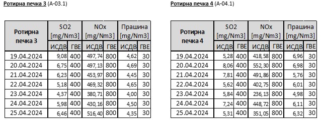 Неделен извештај за измерени средно-дневни вредности на емисии од главните емисиони точки во Цементарница УСЈЕ (19.04.2024 – 25.04.2024)