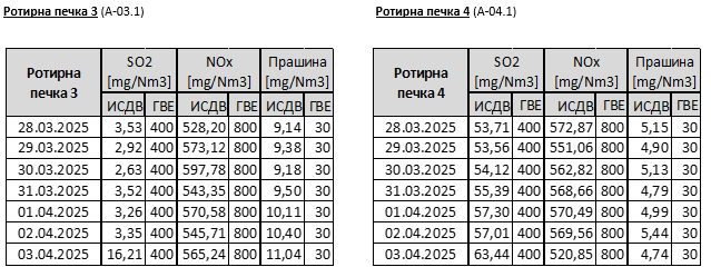 Неделен извештај за измерени средно-дневни вредности на емисии од главните емисиони точки во ТИТАН УСЈЕ (28.03.2025 – 03.04.2025)