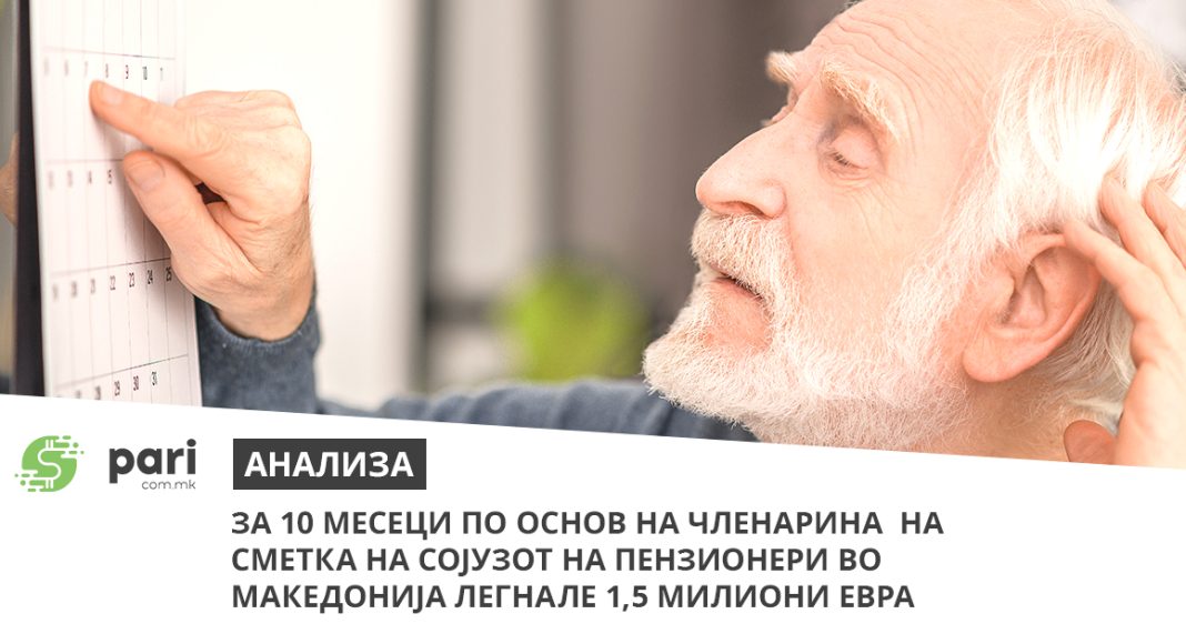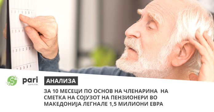ПАРИ АНАЛИЗА | За десет месеци по основ членарина на сметката на Сојузот на здруженија на пензионерите во земјава легнале 1,5 милиони евра, покажува последната статистика на Фондот за пензиско и инвалидско осигурување за месец октомври. На месечно ниво, пак, по овој основ на здруженијата во октомври им се уплатени 155.000 евра.