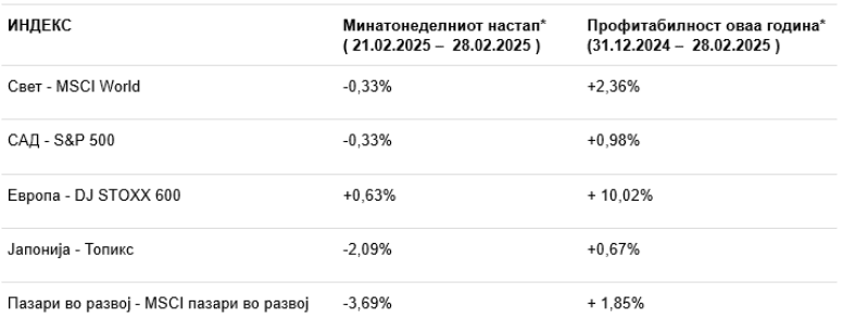 Потрошувачката во САД падна за 0,2% во јануари за првпат по речиси две години, додека инфлацијата достигна 0,3% на месечно ниво и 2,5% на годишно ниво. Продажбата на домови падна на најниско ниво за последните две децении, додека повисоките царини за челик и алуминиум дополнително ги зголемуваат цените на недвижностите. Сопствениците на криптовалути издржаа психолошки предизвикувачка недела бидејќи цената на биткоинот падна под 80.000 долари, што е најниско ниво од ноември минатата година. Падот на цената, исто така, негативно влијаеше на акциите на компаниите поврзани со крипто, при што MicroStrategy и Coinbase ја завршија неделата во црвено, со загуби од 14% и 7%, соодветно. Падот на цените на криптовалутите беше краткотраен, бидејќи пред крајот на викендот, американскиот претседател издаде извршна наредба за додавање криптовалути во резервите на земјата, што овозможи силно нагорно враќање.