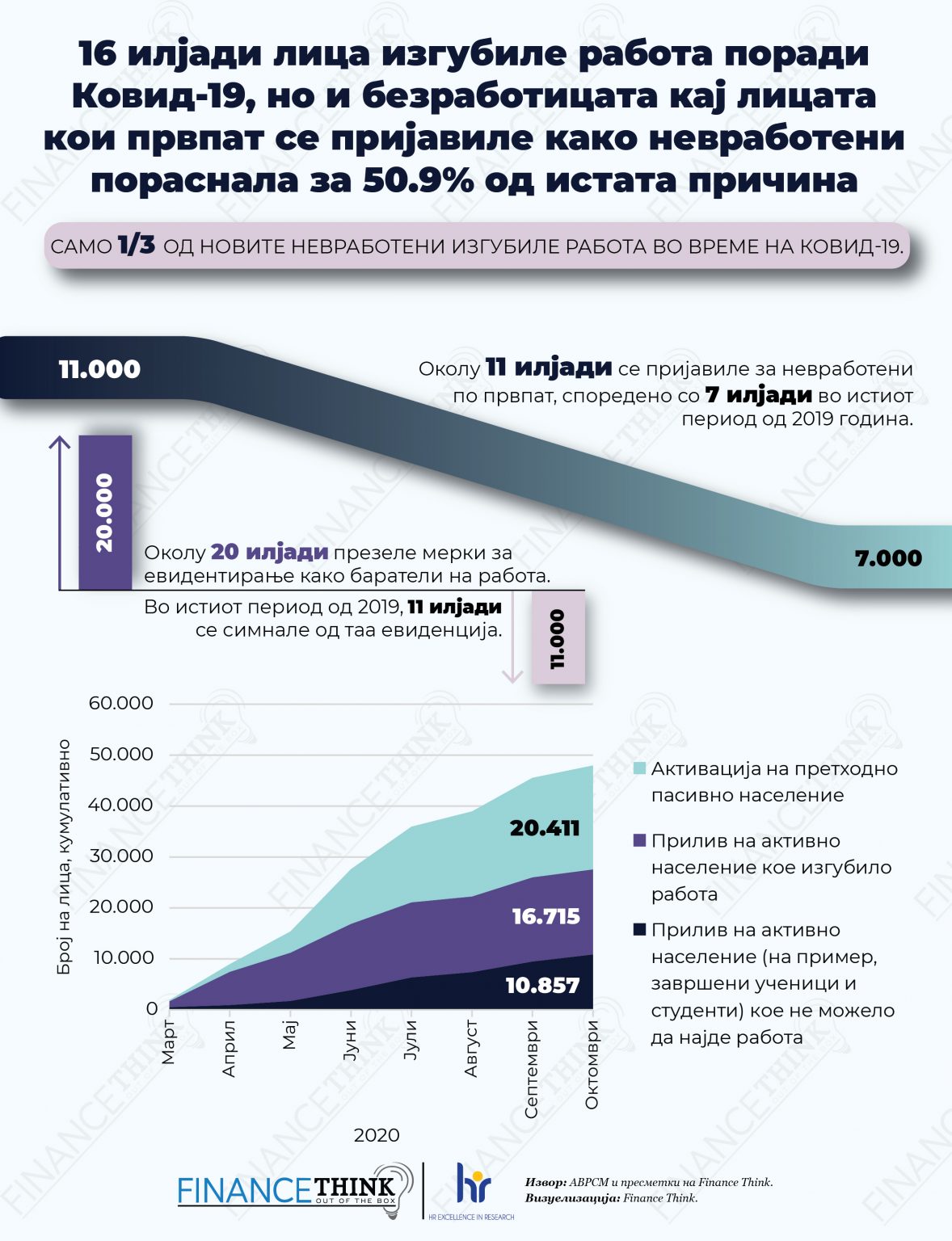 Имено, обемот на нови регистрирани невработени во текот на кризата потекнува од околу 16 илјади лица кои изгубиле работа, ново-пријавени невработени од околу 11 илјади, и нов прилив во регистрираната невработеност од околу 20 илјади.