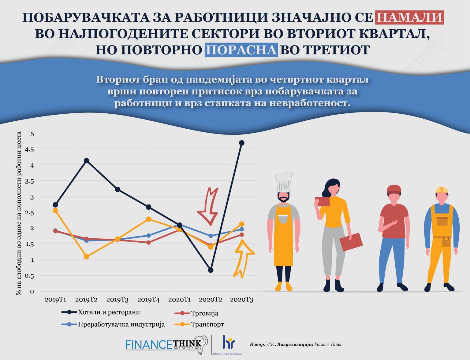 Второ, сепак, притисокот на пазарот на трудот не се сведува само на овие 16 односно 25 илјади лица кои изгубиле работа. Имено, на пазарот има постојан прилив на лица кои првпат се пријавуваат во АВРСМ. Тоа се вообичаено ученици и студенти кои завршуваат со своето школување и првпат се регистрираат на пазарот на труд (т.н. entrants). Во набљудуваниот период, бројот на овие лица бил околу 11 илјади, а во истиот период од 2019 бил околу 7 илјади, што имплицира дека тој притисок се зголемил за повеќе од 50%. Имено, овие лица се соочени со значајно зголемен ризик од ненаоѓање работа, поради што се пријавуваат како активни баратели на работа во АВРСМ, почесто од тоа што се пријавувале во нормални околности. Слика 2 укажува дека побарувачката на работна сила во вториот квартал, во најпогодените сектори, значајно се намалила, што е приближен приказ на тоа дека притисокот на пазарот на трудот за подолго останување во состојба на (регистрирана) невработеност се зголемил.
