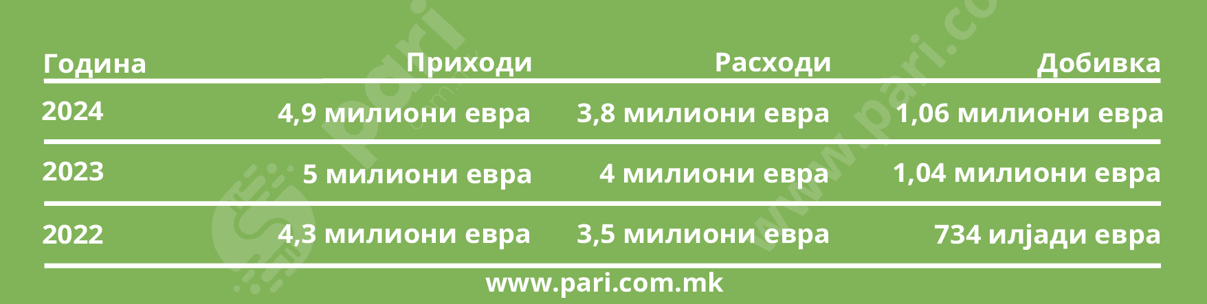 Но затоа, две години по ред профитот е над милион евра. Во 2024 – еден милион и 67 илјади евра. За 2023 добивката е послаба за 24 илјади евра.