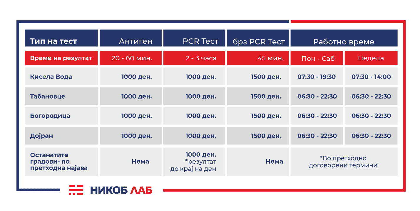 *** Задолжително е закажување за тестирање преку web порталот на НИКОБ ЛАБ https://booking.nikoblab.his.mk/ или на телефонскиот број 02/274-1000.