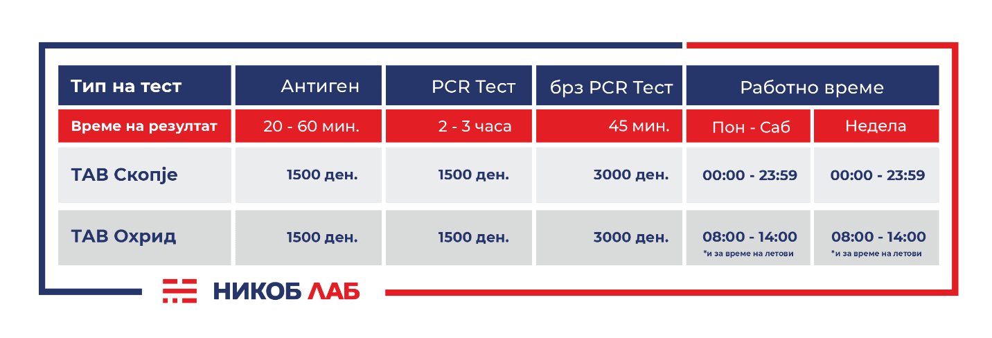 Со задоволство Ве информираме дека од четврток 24.06.2021 започнуваат со работа нашите пунктови на Табановце, Богородица, Дојран, Кисела Вода и на аеродромите ТАВ Скопје и ТАВ Охрид. НИКОБ ЛАБ како општествено одговорна Компанија вложува огромни средства и напори да им излезат во пресрет на сите граѓани на кои во текот на годишните одмори ќе им бидат потребни PCR и брзи антигенски тестови за патување во странство.