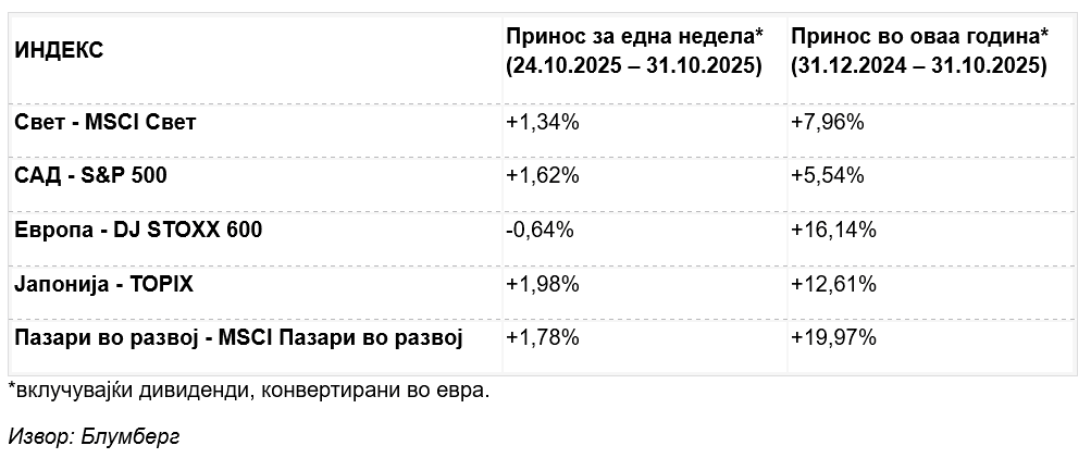 Минатата недела на глобалните пазари беше исполнета со значајни настани: состаноците на водечките централни банки, новото трговско примирје меѓу САД и Кина и продолжувањето на сезоната на објава на корпоративни резултати. Во оваа динамична слика, американскиот пазар повторно го задржа водството, поттикнат од технолошките гиганти.