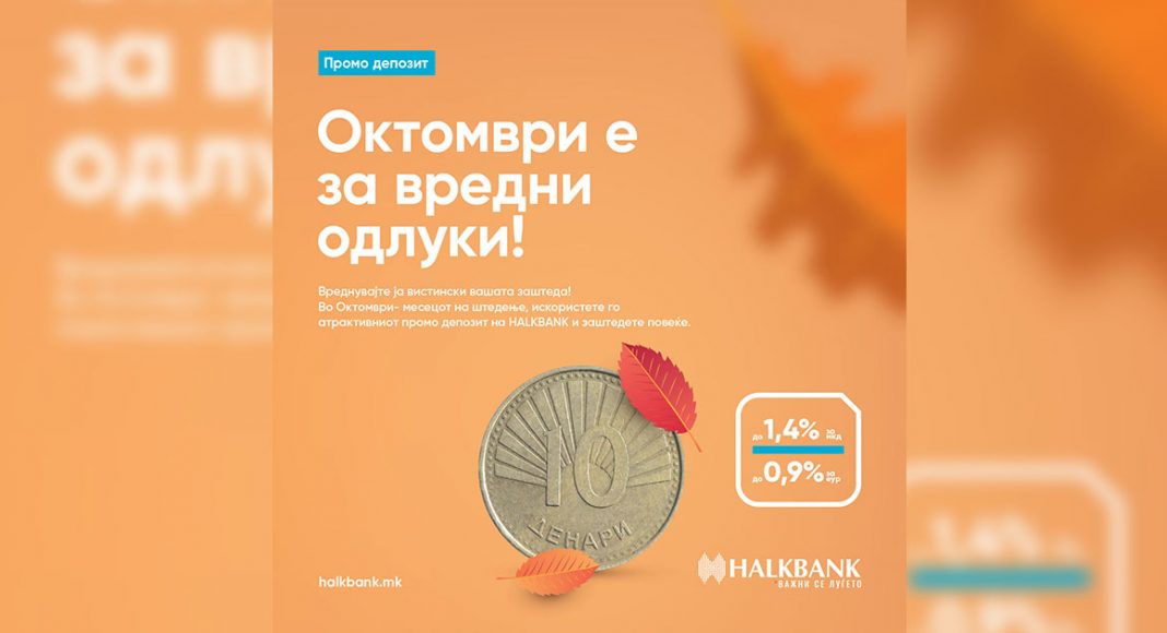 Овој октомври, во светскиот месец на штедење, Халкбанк АД Скопје подготви нов промотивен производ за штедење – ПРОМО депозит кој нуди можност за орочување на средствата на 13 и 25 месеци. Новиот депозитен производ е наменет за физички лица и овозможува штедење во денари или во евра. Понудата за Промо депозит важи во месецот на штедење, односно од 01.10 – 31.10.2020 година.