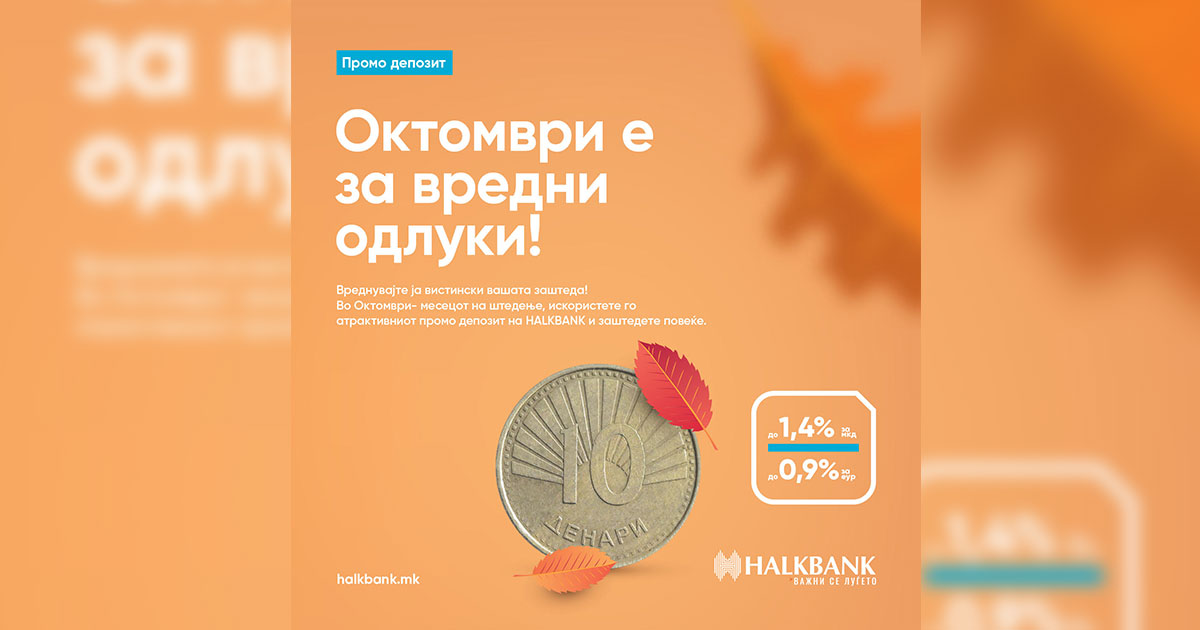 Никогаш не е доцна да се почне со штедење. Треба само да се избере производ кој одговара на потребите и банка која ќе биде сигурен партнер. А тоа, овој октомври, може да биде токму Промо депозитот и Халкбанк.