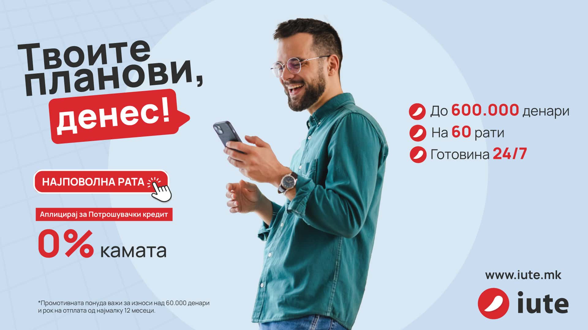 Аплицирањето е достапно онлајн, преку мобилната апликација Myiute, со посета на најблиската експозитура на Иуте, или пак преку контакт центарот за корисници на 13 333, со важност на понудата до 9ти март.