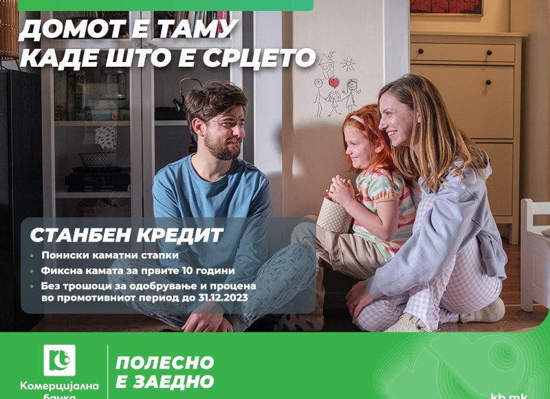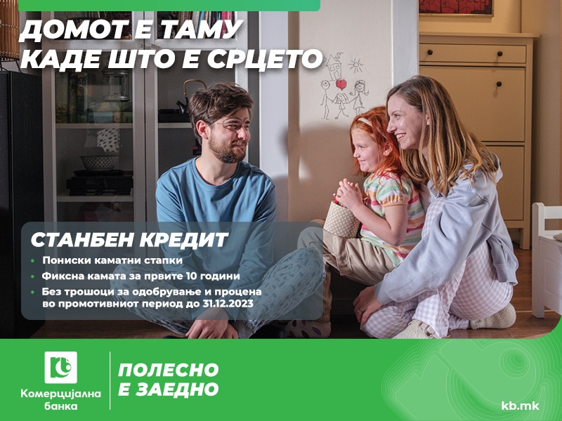Сега имаш повеќе причини за да се радуваш на нов дом! Пониски каматни стапки, фиксна каматна стапка на 10 или 5 години и без трошоци за одобрување и процена добиваш со Станбениот кредит на Комерцијална банка.