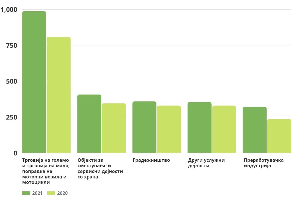 - Во 2021 година забележана е зголемена активност во секторите градежништво, каде отворени се 154 компании повеќе во споредба со 2020 година, а истиот тренд е евидентиран и кај преработувачката индустрија, со пораст од 85 компании.