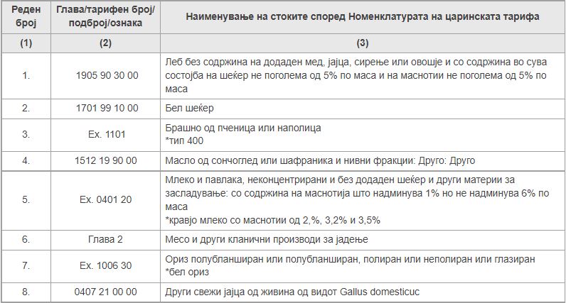 Од денеска маркетите кои продаваат основни прехранбени производи мора да ги имаат прилагодено фискалните апарати со даночна стапка од 0%. Станува збор за сите маркети кои продаваат леб, брашно тип -400, млеко со масленост од 2%, 3,2% и 3,5 % масленост, бел шеќер, сончогледово масло, месо и други кланични производи за јадење, бел ориз. Ова значи дека од денеска 17 март продажните објекти што ги продаваат овие производи мора да ги имаат прилагодено фискалните апарати така што потребно е да издаваат фискална сметка со даночна стапка од 0%, односно со ознака „Г“ за добра и услуги кои се ослободени од данокот на додадена вредност.