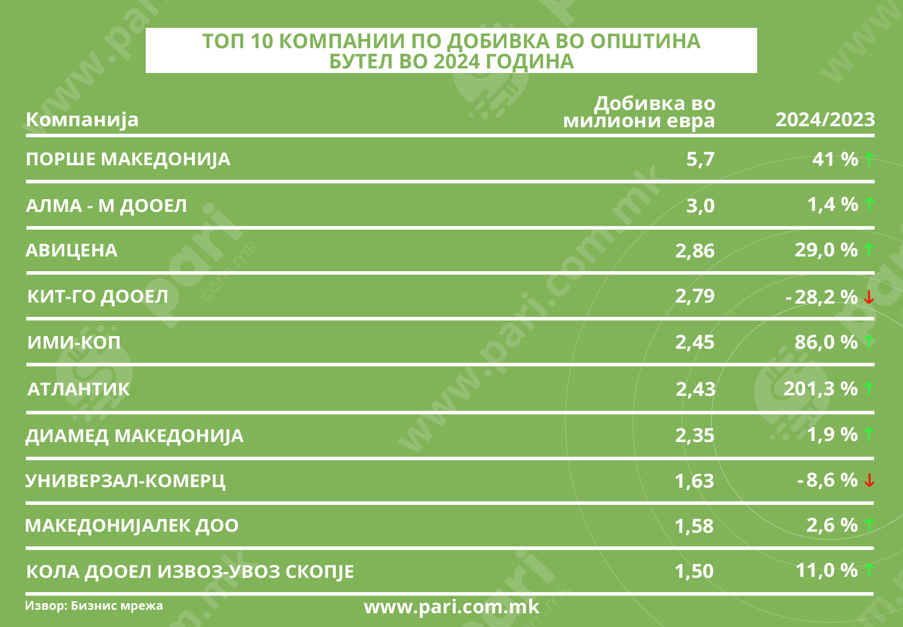 Добивката на ПОРШЕ МАКЕДОНИЈА е двојно поголема од добивката на второрангираната компанија. Со профит од 5,7 милиони евра во 2024 година, оваа компанија значајно ги претркала сите други во Општина Бутел.