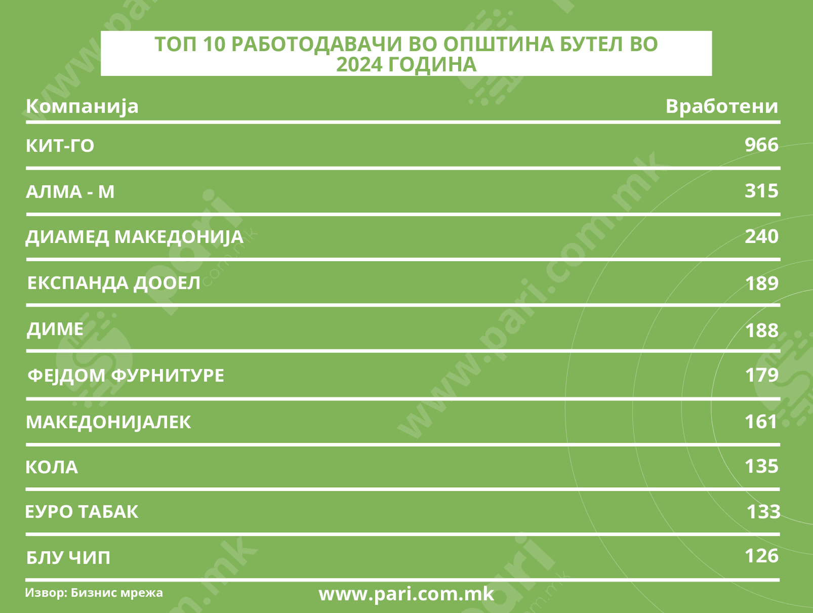 Најмногу вработени има во синџирот маркети КИТ-ГО. Компанијата има 966 вработени, но со оглед на распространетоста на нивните маркети во сите општини, во Општина Бутел се слева дел од данокот на личен доход само на вработените што живеат во таа општина. Сè почесто вработените си работат во маркетот во општината каде што живеат.