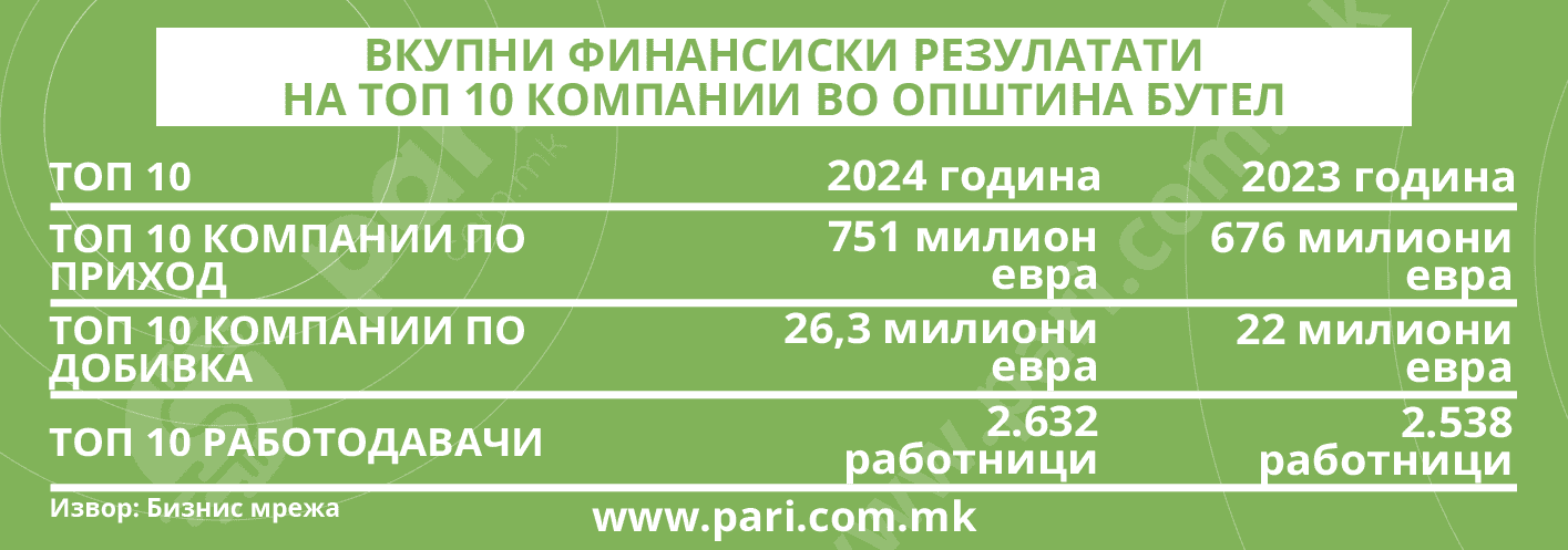 Анализата на Пари во соработка со Бизнис мрежа открива дека 10-те најголеми компании по приход во општината оствариле промет од дури 751 милион евра. Заедничкиот приход на овие компании во 2023 година бил значајно помал и изнесувал 676 милиони евра, што значи дека приходот скокнал за 11 насто. Најголемите 10 компании по добивка во Општина Бутел, во 2024 година имале заедничка добивка од 26,3 милиони евра, а нивната заедничка добивка во 2023 година била 22 милиони евра. Заедничката добивка на овие 10 фирми скокнала за дури 19,5 насто!