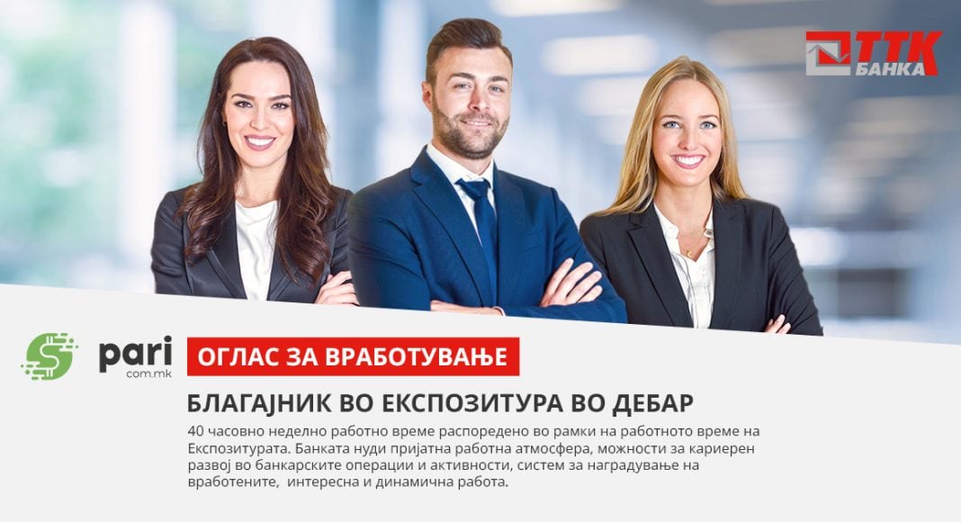 Банката има моментална потреба за вработување на ново лице на работна позиција во рамки на Дирекцијата деловна мрежа, кое ќе цели кон усовршување на благајничките операции, грижа на клиенти и промовирање на производите и услугите кои ги нуди Банката. Од тие причини, ТТК Банка А.Д. Скопје објавува: