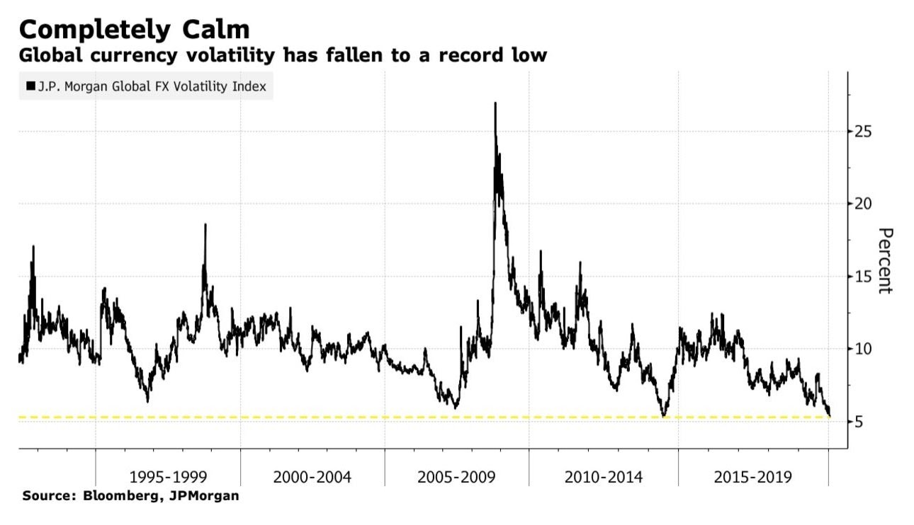 Нестабилноста на глобалната валута се спушти на рекордно ниско ниво. Извор: Блумберг, ЈППорган