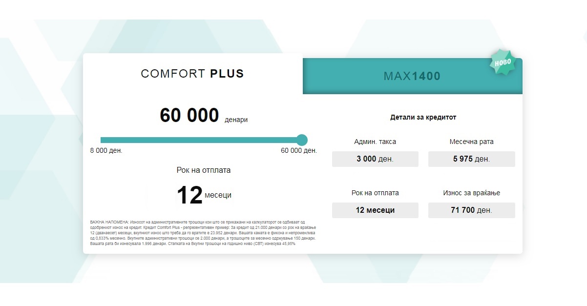 ФД Монимакс Финансиско Ви нуди поволни услови и фиксна каматна стапка од 0.833% за целиот период на отплата, со еднократен административен трошок во износ од 800 – 3.000 денари. Износот на кредитот е од 8.000 денари до 60.000 денари. Стапката на вкупни трошоци (СВТ) изнесува 49.95%.