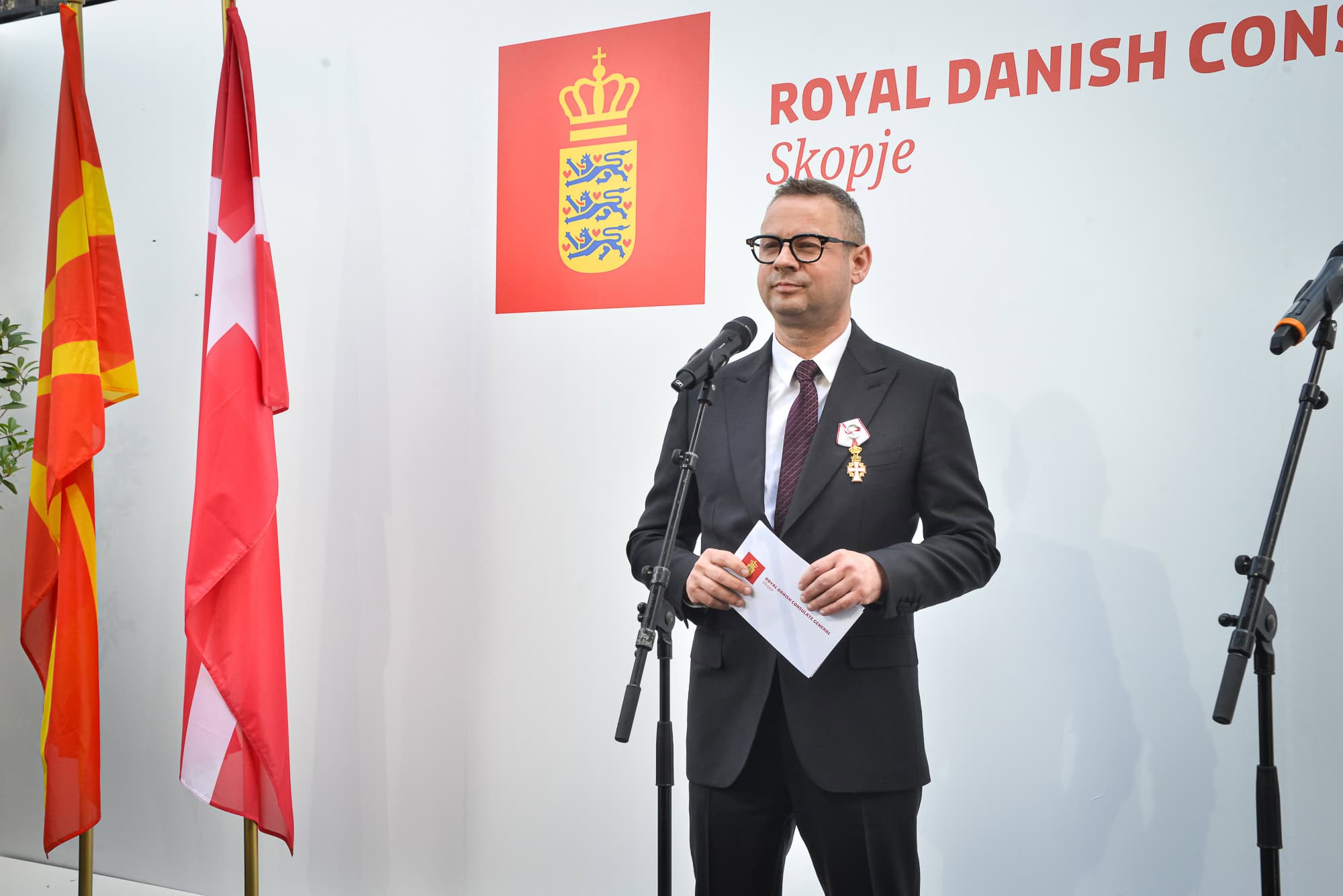 Како повод за славење го истакна и воздигнувањето на Живко Мукаетов од Витез на Редот на данското знаме, орден што го доби во 2016 година, во Витез од 1ва класа на Редот на данското знаме. Притоа, амбасадорката Шајн, во името на данската Влада, му се заблагодари на Мукаетов за неговата умешна дипломатија, силна посветеност и беспрекорен професионализам како Генерален конзул.