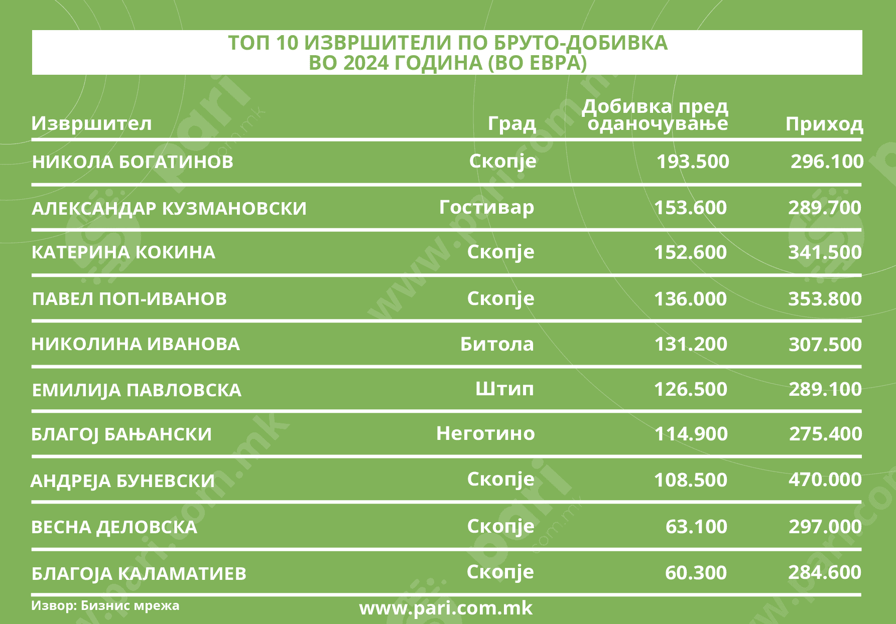 Оваа анализа на Пари се базира на најдобрите извршители ‒ по приход и профит. Шестмина од нив се со адреса во Скопје, а по еден во Битола, Гостивар, Штип и Неготино. Интересно е да се наведе дека на ниво на целата бранша, десеттемина со најголем остварен промет и со заедничките 3,2 милиони евра, имаат удел од речиси една четвртина во вкупниот приход. Конкретно, износот е 24,79 отсто. Истите тие се и во ТОП 10 по добивки и направиле вкупна добивка пред оданочување од 1,2 милиони евра.