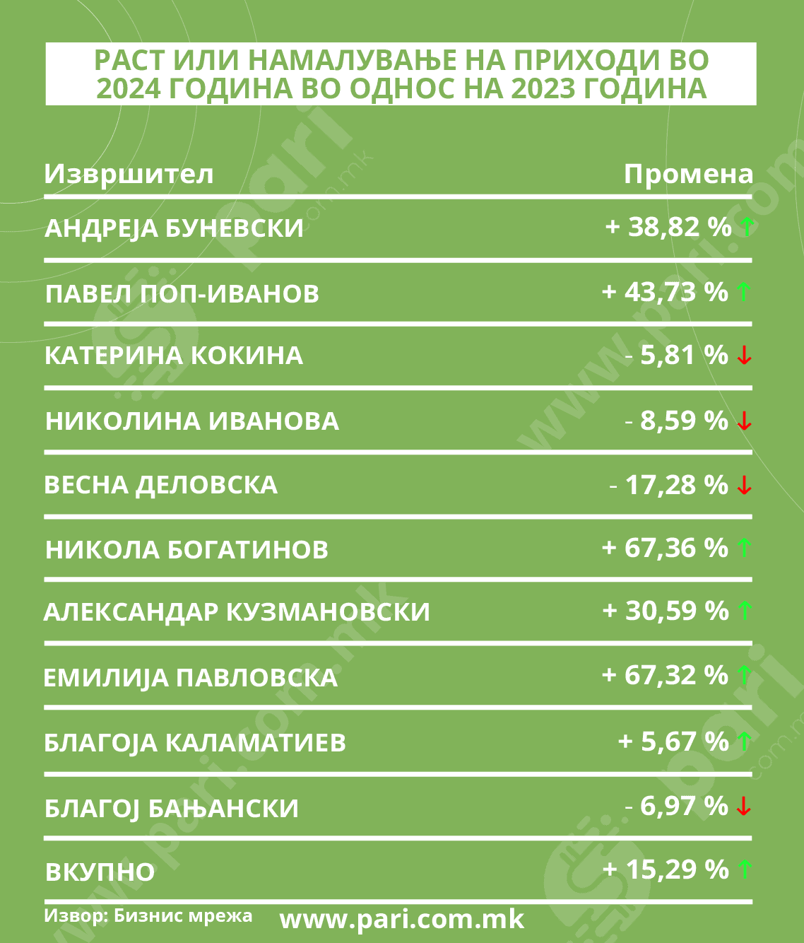 Со највисоките остварени приходи, од 470 илјади евра, се издвојува Андреја Буневски. Проследени се со раст од 38,82 насто, кој е во голем расчекор со процентуалното зголемување на добивката (+ 85,46 насто). Во тој сегмент скопскиот извршител го зазема осмото место.