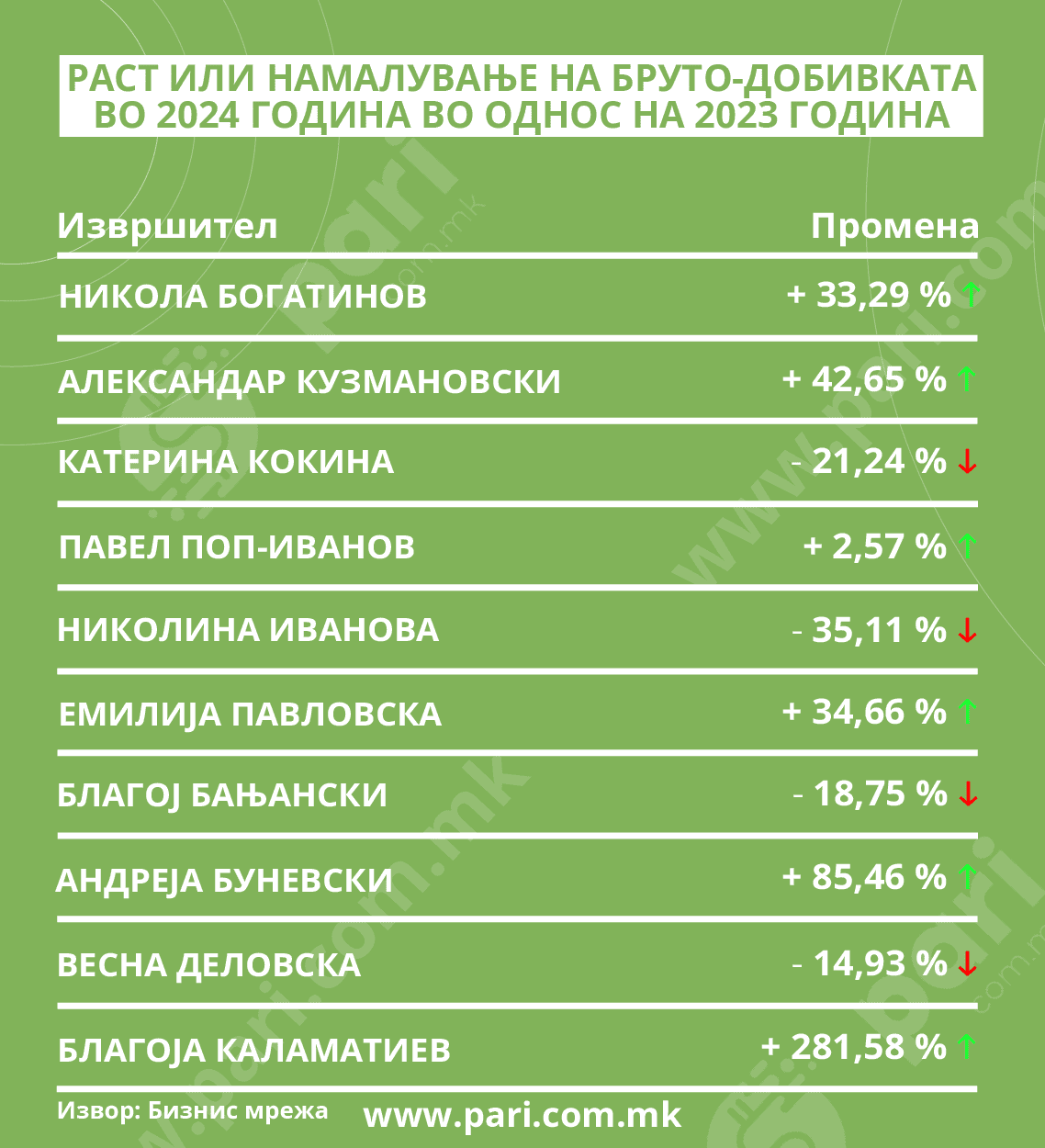 Кога се анализираат промените на добивките во однос на претходната година, еден извршител особено се издвојува, а тоа е Благоја Каламатиев, чија добивка пред оданочување направила скок од високи речиси 282 насто. Но, тоа не му озбезбедило повисоко место во топ десетте, односно се наоѓа на крајот од листата. Растот, пак, на приходите не соодветствува со тој на добивката и изнесува 5,67 насто.