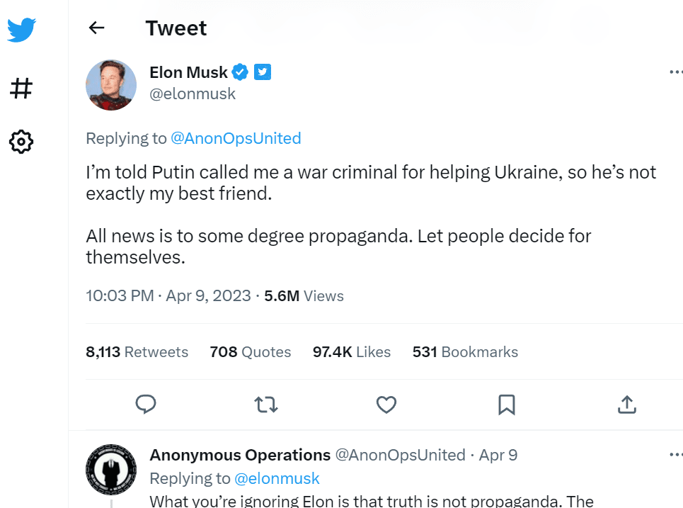 Отфрлајќи го повикот за забрана на Медведев, Маск одговори: „Сите вести се до одреден степен пропаганда. Оставете ги луѓето сами да одлучат“.