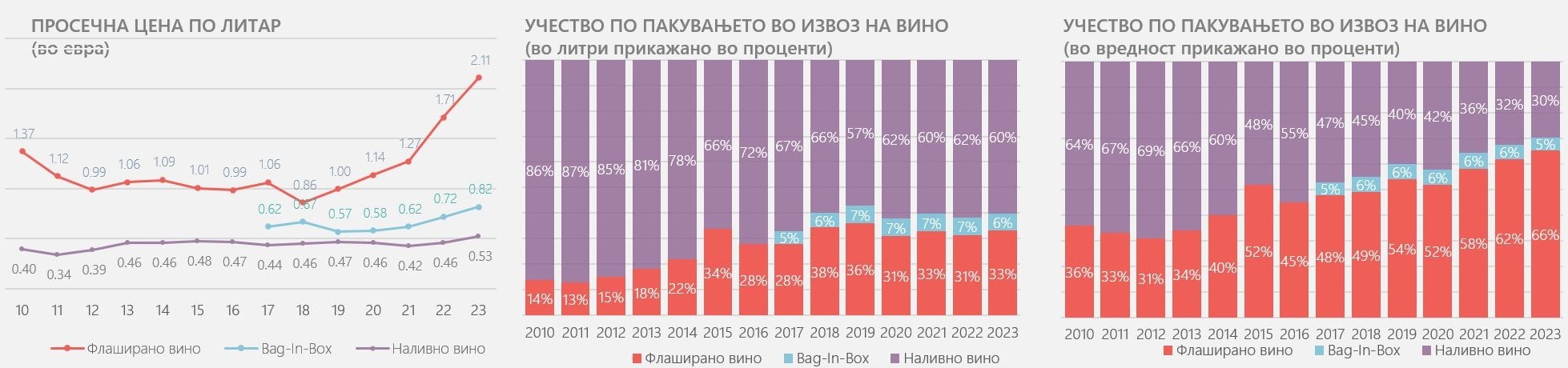 Според податоците на здружжението, просечната цена за литар извезено флаширано македонско вино е зголемена од 1,14 евра во 2020 година, на 2,11 евра во 2023 година. Истовремено, во последните неколку години променета е и структурата на извозот, при што сега близу 40% од извезеното македонско вино во странство е флаширано, што генерира дури над 70% од вредноста на целокупно извезеното вино.