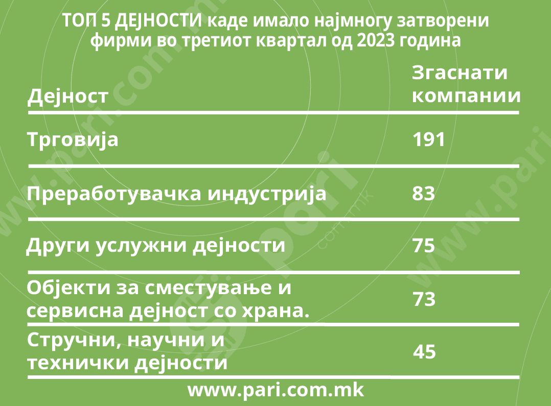 Во петте дејности каде што има најмногу затворања на фирмите, згаснале влупно 467 фирми, или 67,7 отсто од сите затворени компании во третиот квартал од годинава.