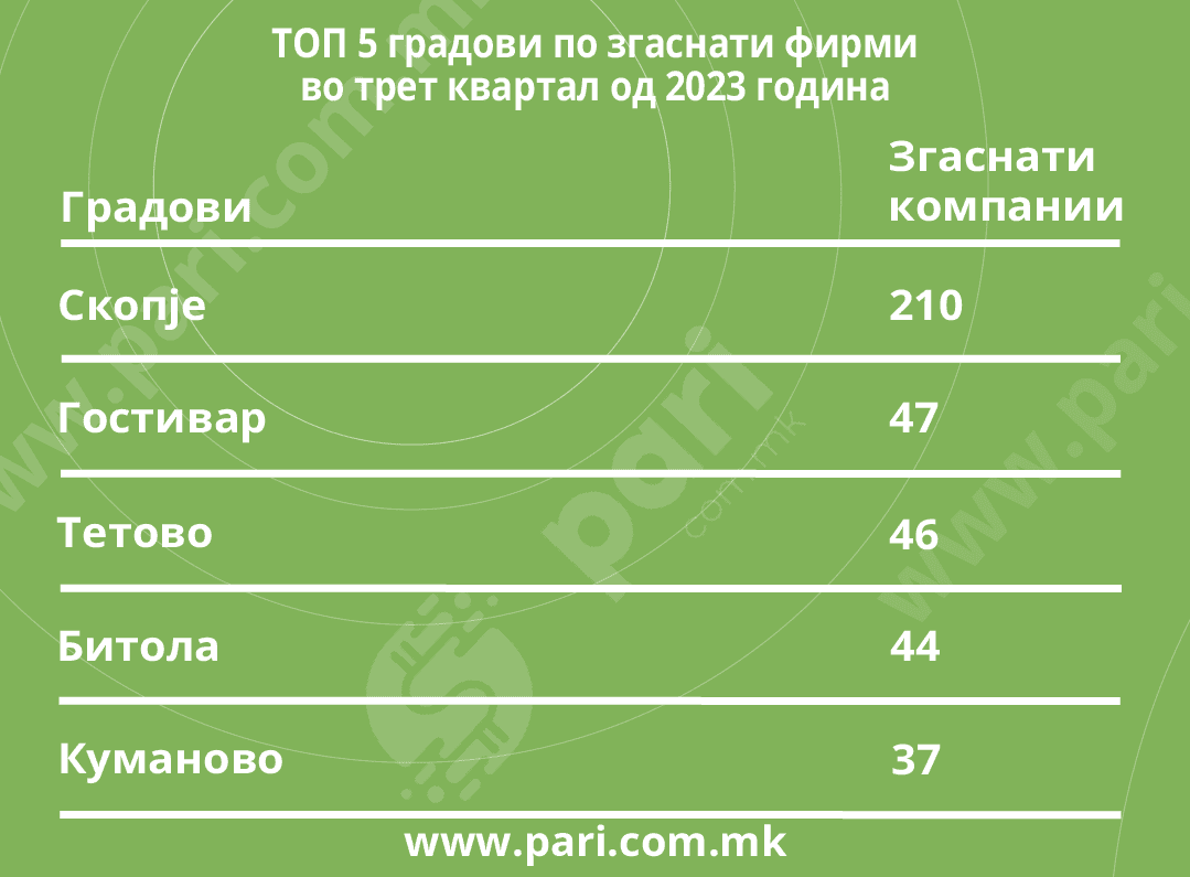ВО КОИ ГРАДОВИ ИМА НАЈМНОГУ ЗГАСНАТИ ФИРМИ?