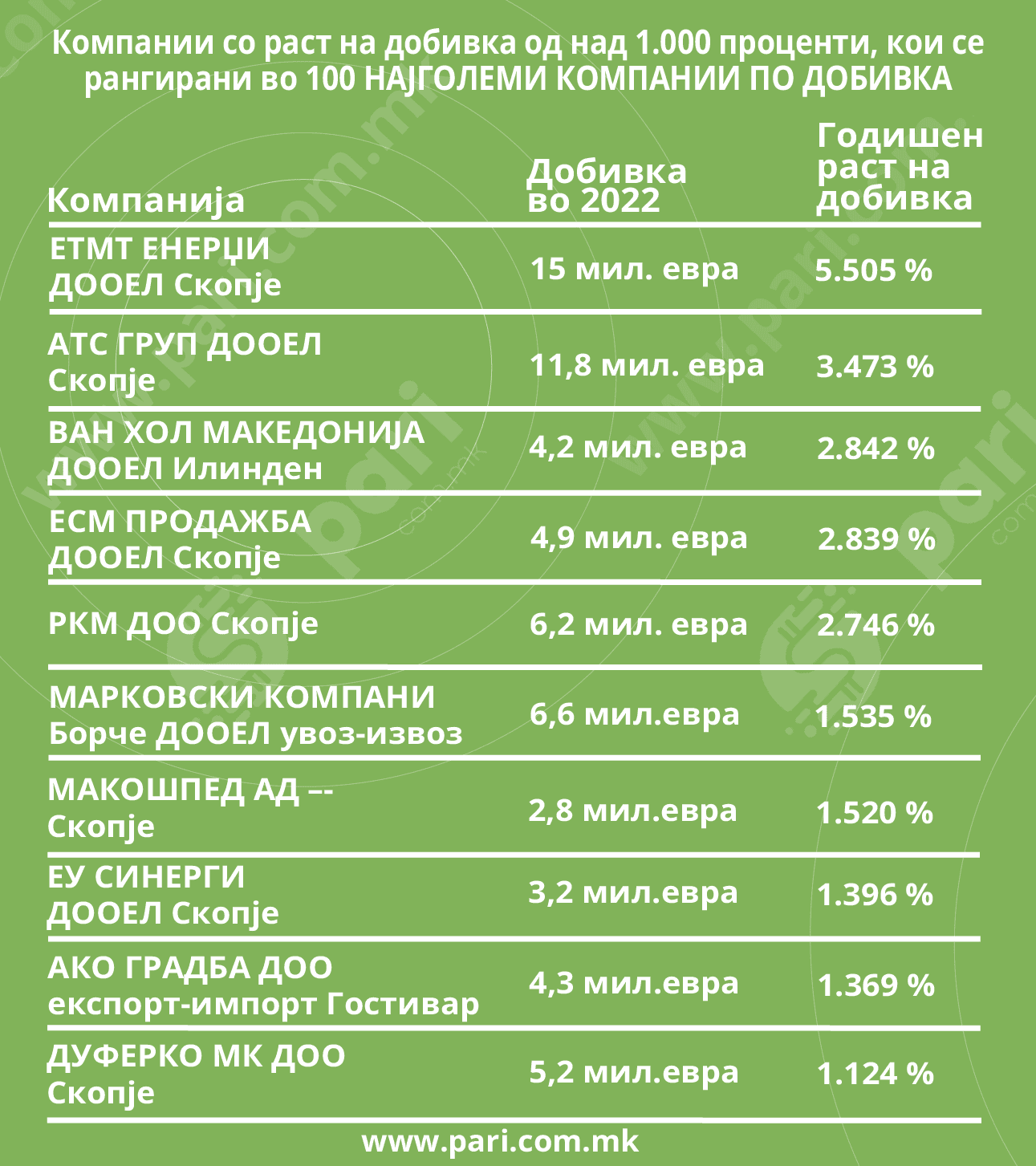 Порталот Пари, во соработка со БизнисМрежа.мк, ги анализираше податоците на 100те најголеми фирми по добивка во 2022 година и откри дека многу од нив во 2021 година воопшто не биле во ова друштво и дека за да го направат скокот направиле огромни добивки.