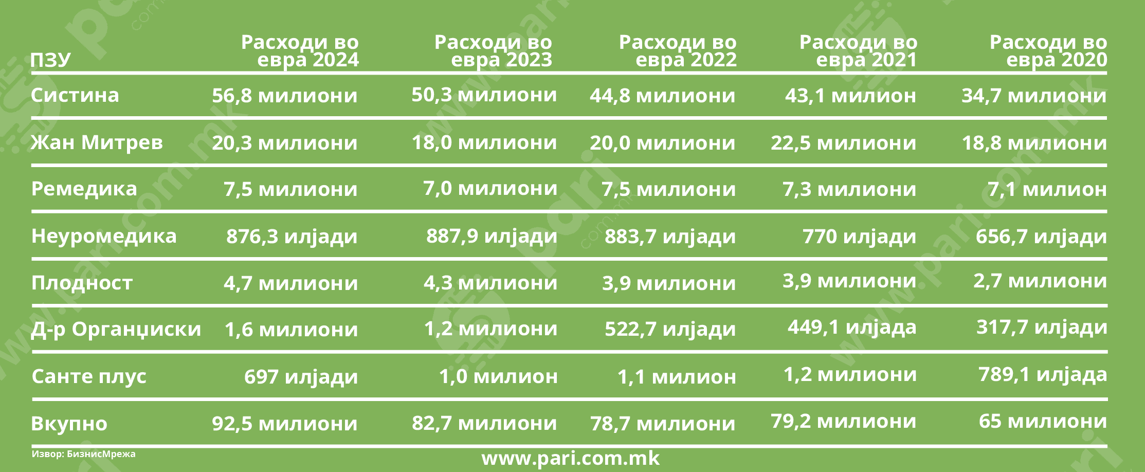 Приватните здравствени установи имаат и сериозни трошоци, чија заедничка вредност е 92,5 милиони евра и за една година нараснала за безмалку 10 милиони евра. Нивните расходи лани се движеле од 697 илјади во „Санте плус“ до 56,8 милиони евра во „Систина“. Всушност, „Санте плус“ (-30,55%) и „Неуромедика“ (-1,31) се единствените две болници кои успеале да ги скратат давачките.