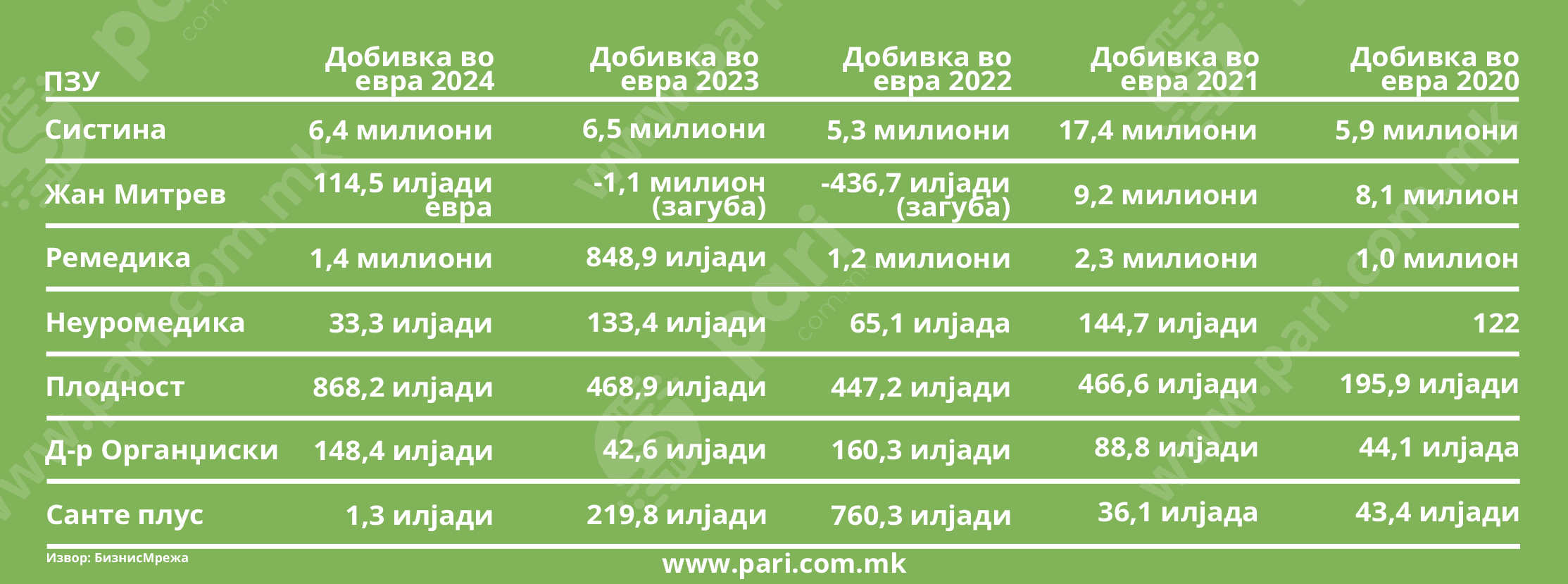 Анализа на нивните финансиски резултати, што ја направи порталот Пари користејќи ги податоците од БизнисМрежа, покажува дека и овде работењето е проследено со подеми, падови и пресврти. Притоа, може да се констатира: „Систина“ ја зацврстува водечката позиција, „Жан Митрев“ по загубите се враќа во позитива, „Ремедика“ има стабилен развој, „Неуромедика“ се движи по блага удолнина, „Плодност“ полека, но сигурно расте, кај „Д-р Органџиски“ растот е забрзан, а „Санте плус“ е во фаза на драматичен пад.