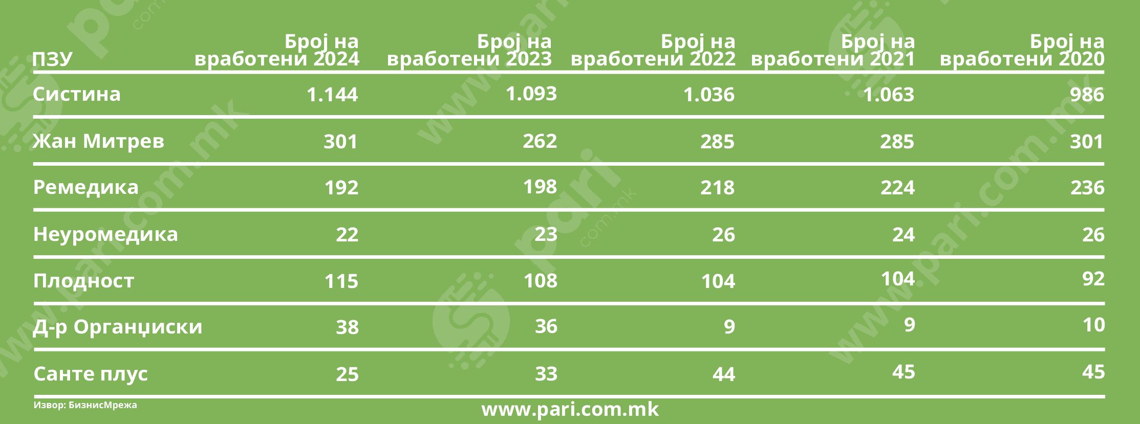 „Систина“ е најголемиот работодавач меѓу овие здравствени институции. Тимот минатата година броел 1.144 вработени. Споредено со 2023, има промена од 4,67%, или повеќе за 51 ангажирано лице. Во овој поглед расте и „Жан Митрев“, чиј кадар од 301 вработен, повторно се врати на нивото од 2020 година. Во меѓувреме имало мали осипувања, но последната годишна разлика е за 14,89%.