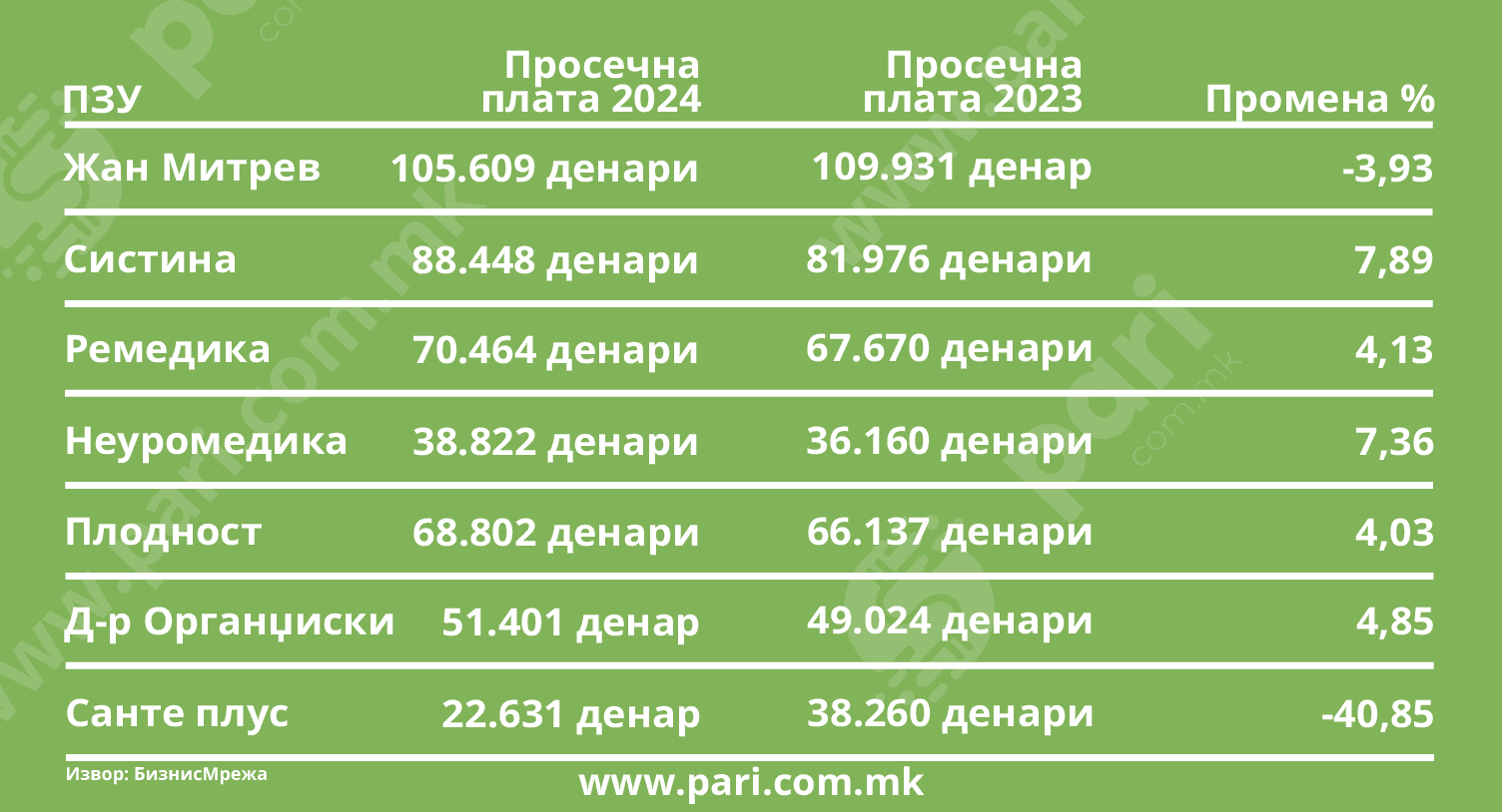 Кога станува збор за платите, највисоки се примањата во „Жан Митрев“. Просечно исплатената плата во 2024 била 105.609 денари. Но, првпат има пад од скоро 4%. Спротивно на тоа, „Систина“ ја зголемила просечната плата за 7,9%. Извесни зголемувања има и кај другите четири приватни болници „Плодност“ (4,03%), додека „Неуромедика“ (4,13%), „Д-р Органџиски“ (4,85%) и „Ремедика“ (7,36%).